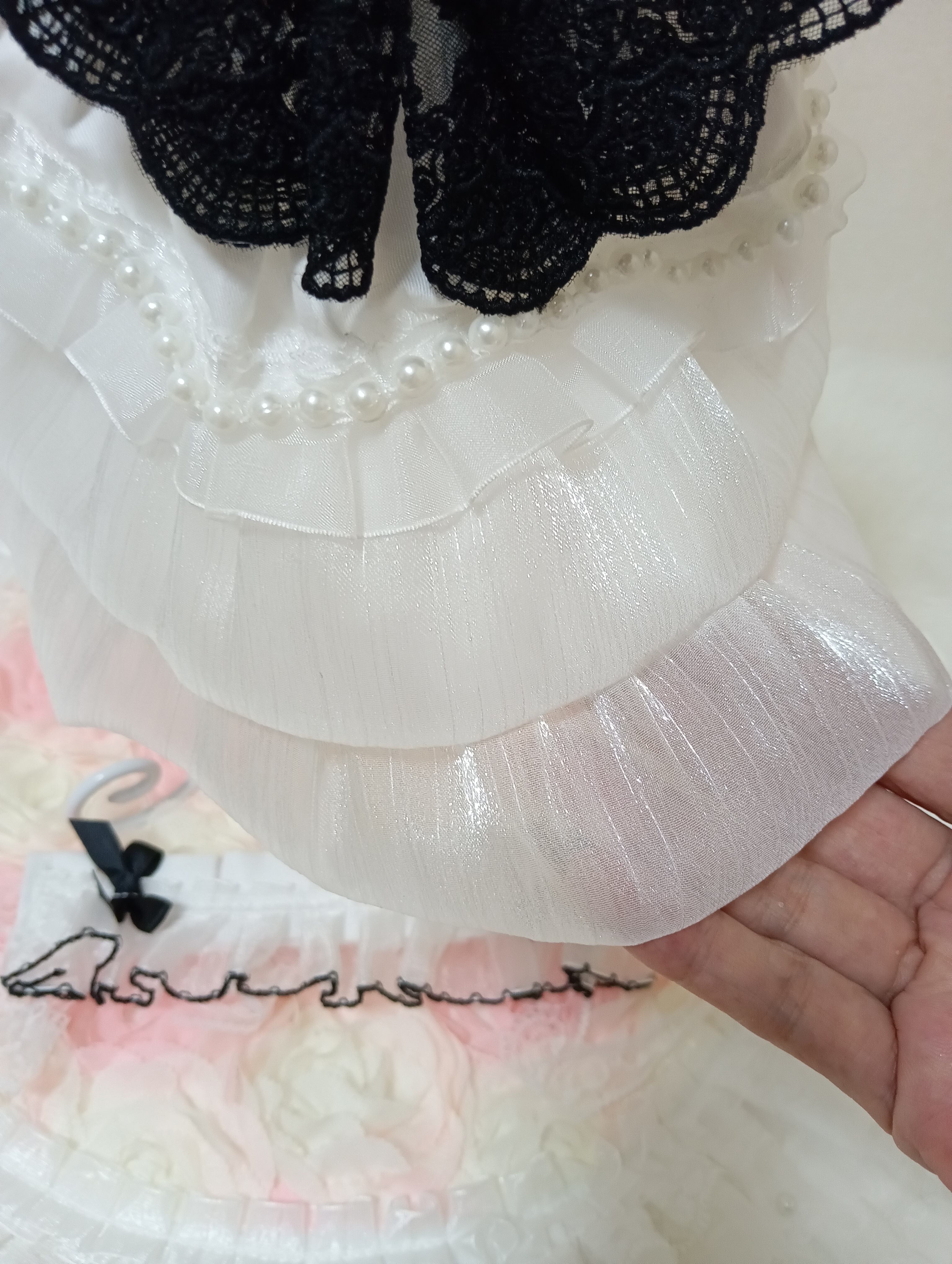 ホワイトのコットンにワンピースの裾フリルは光沢のあるシフォン素材の上品なモノトーンワンピース♡パールの飾りも、ブラックのレース素材のリボンも素敵です。