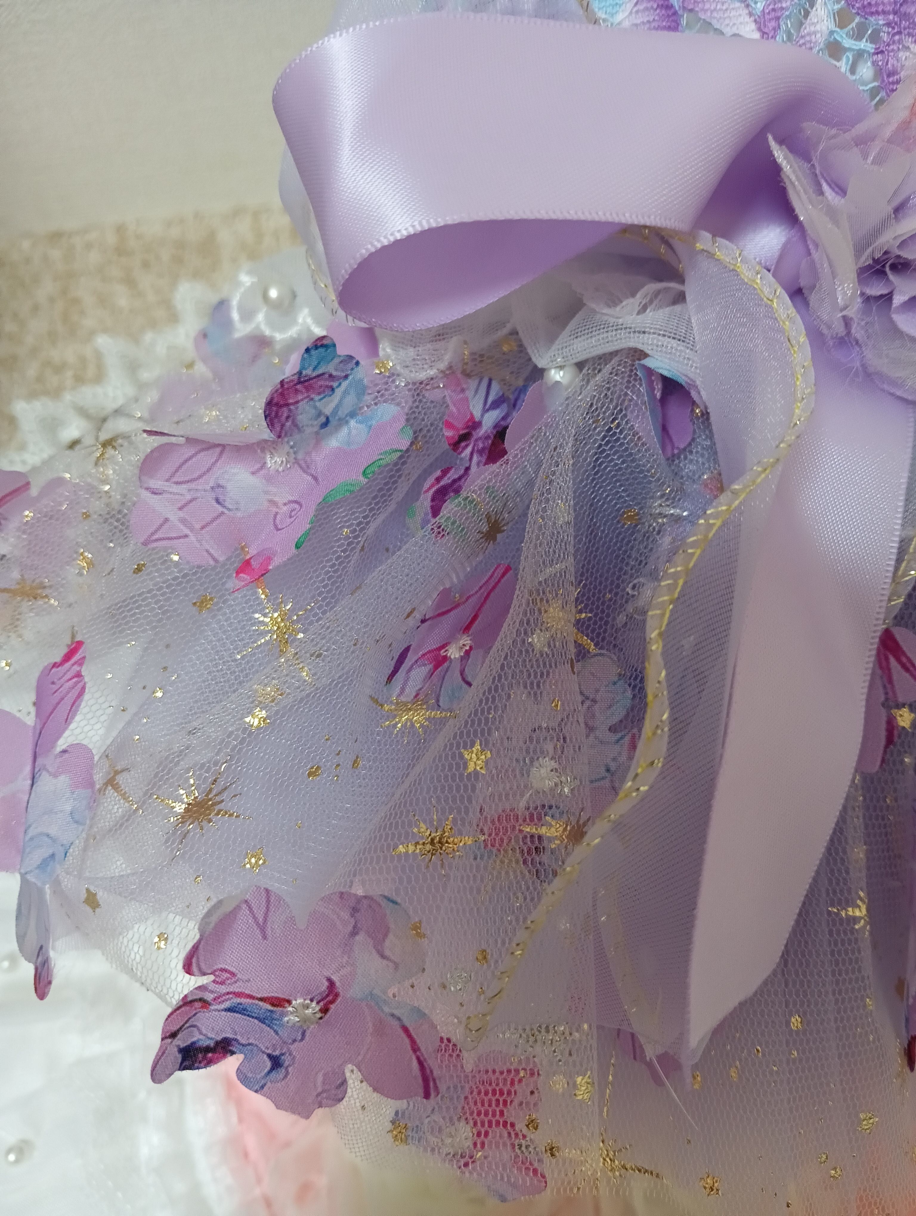 腰のお花モチーフのリボンもラブリーです。3枚目からの実物写真のほうが柄がわかりやすいと思います。