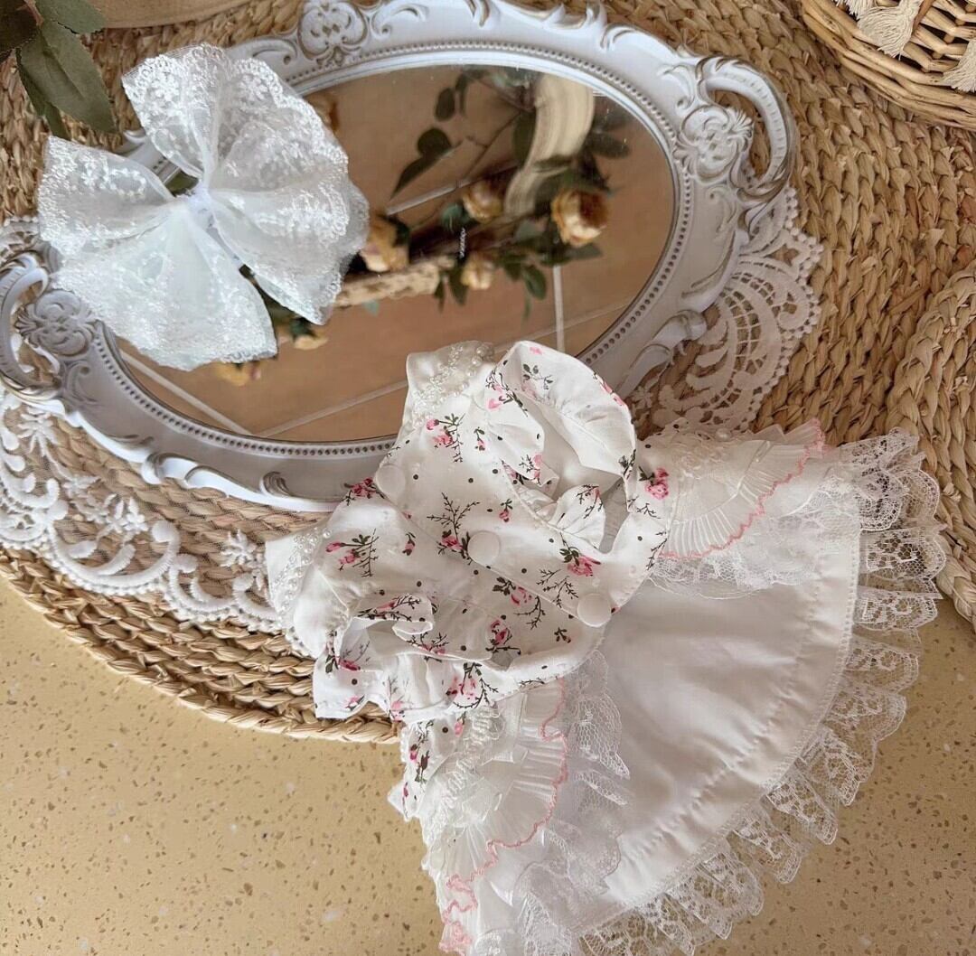 【予約商品】Xmya 小花柄のパール飾りの襟付きワンピース