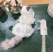白にブルーの花柄生地が可愛い、首元から裾までレース使いがエレガントなワンピース♡