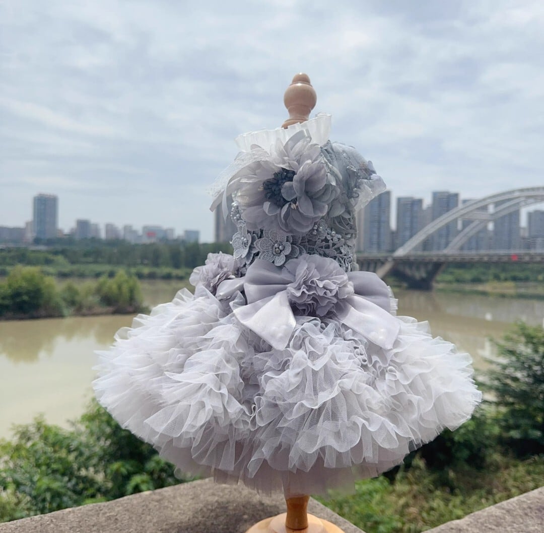 腰の両サイドにお花モチーフのリボンが付いて、背中部分も豪華なフラワーモチーフがたくさんのお洒落なグレーのショートドレス♡
