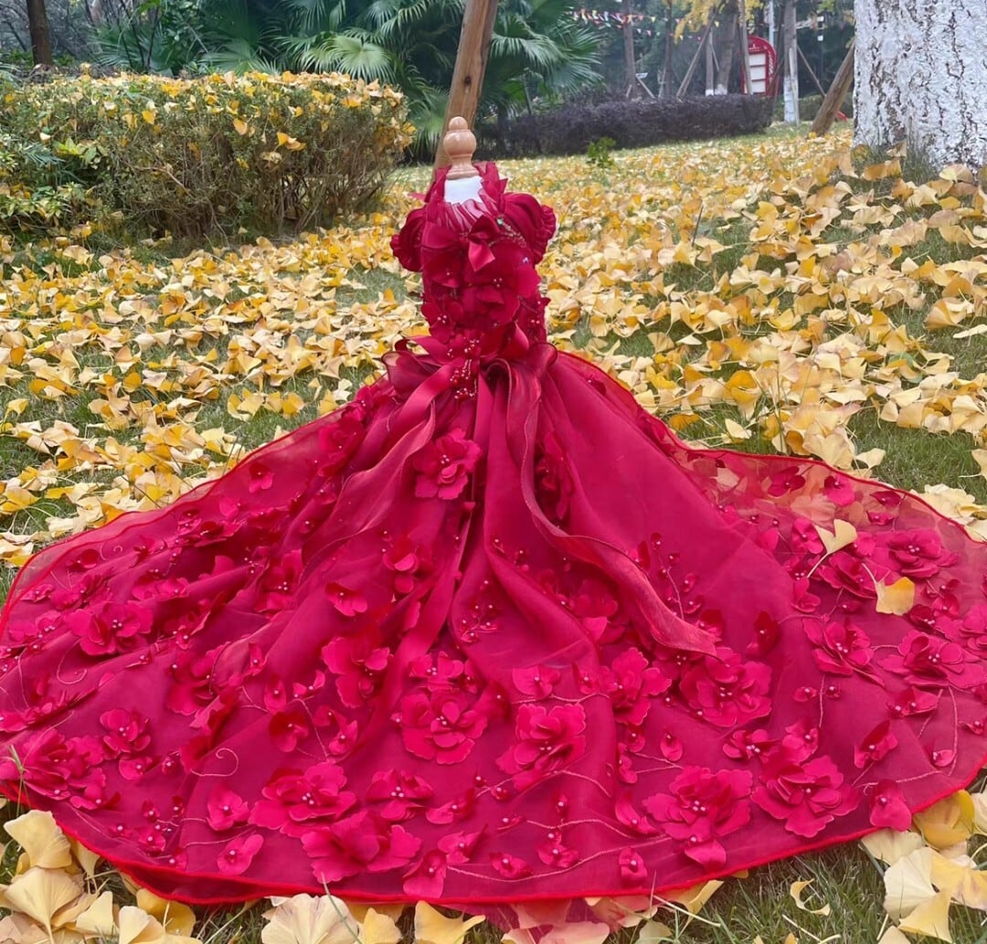 ドレス全体にフラワーモチーフがたくさん施されたバーガンディーのロングドレス♡