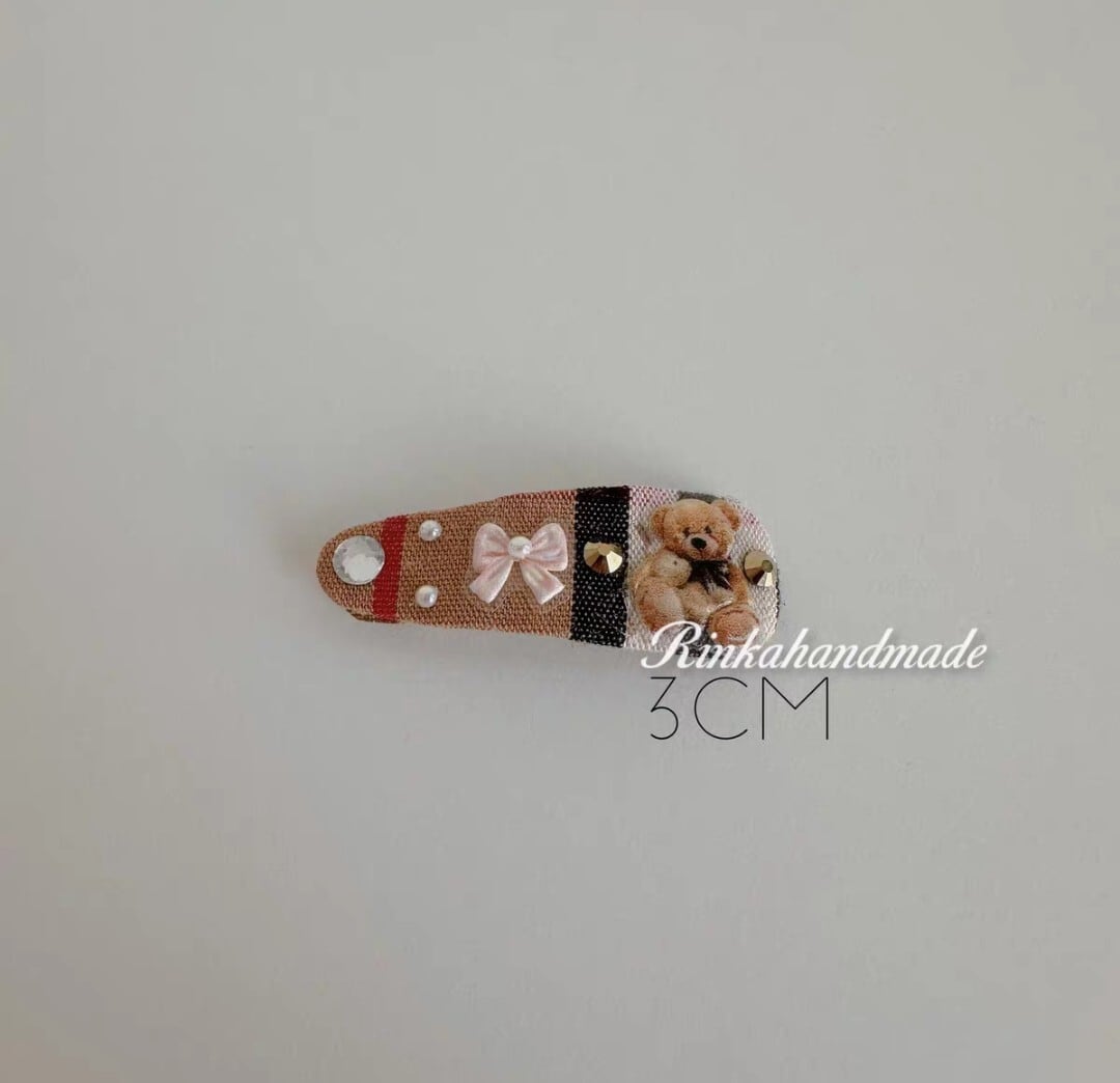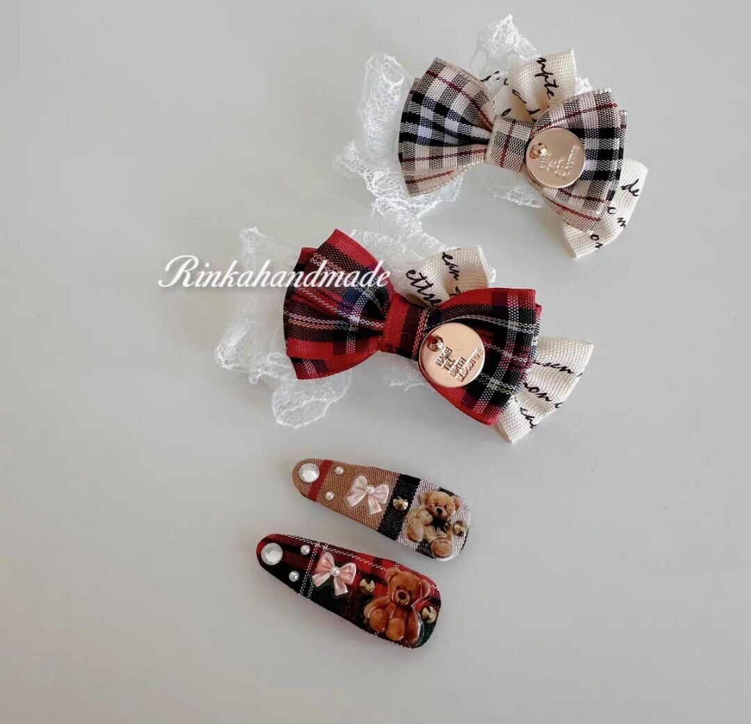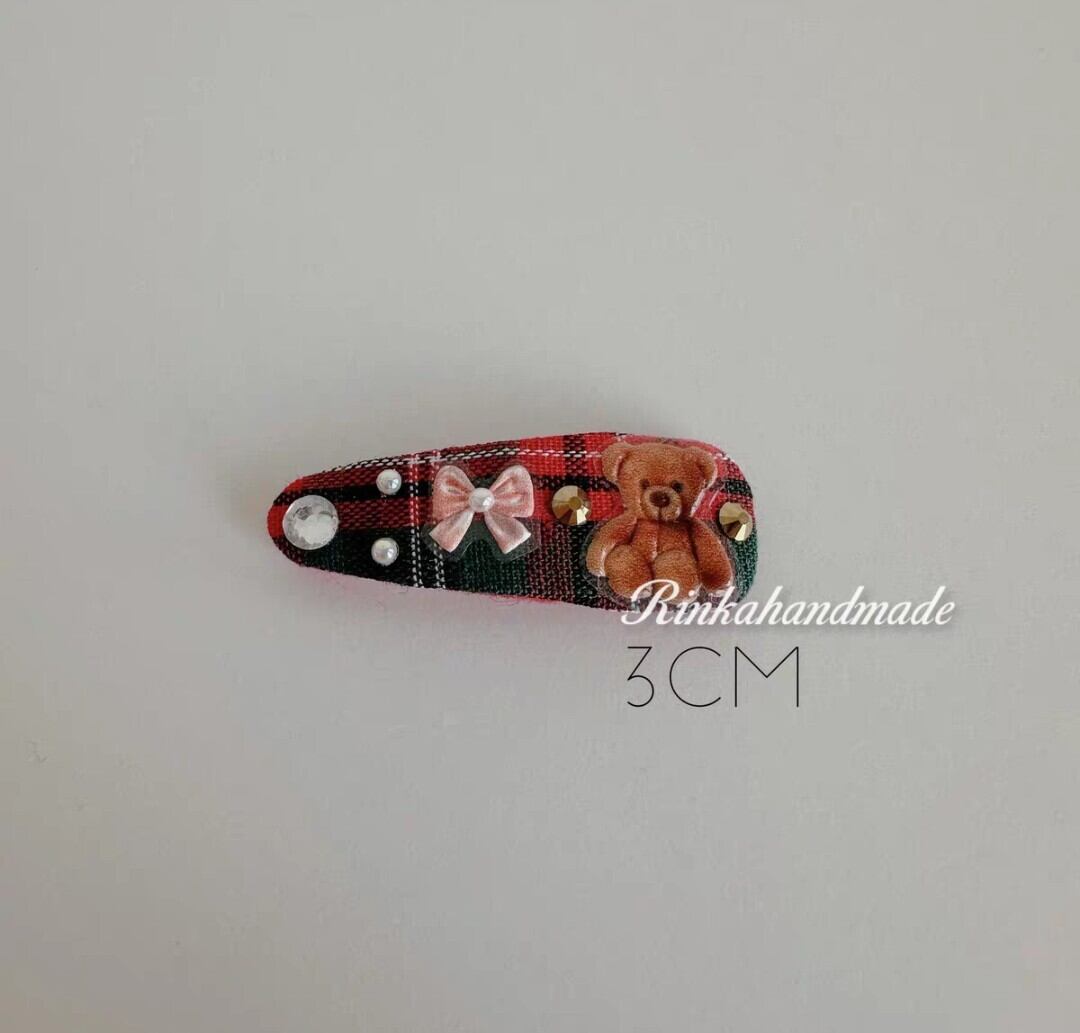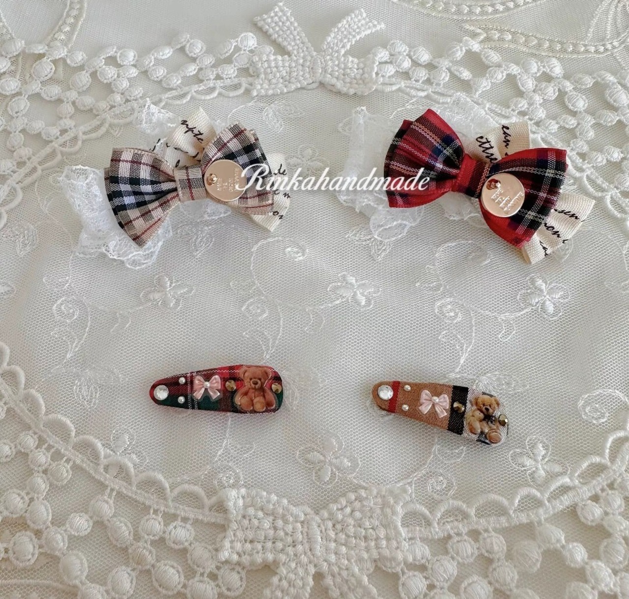 くまちゃん柄のクリップも、オプションからご予約購入可能です。レッドのタータンチェックのおリボンには赤系のくまちゃん柄のクリップ、ブラウンのタータンチェックには茶系のくまちゃん柄のクリップが付きます。6枚目、7枚目の着用画像の組み合わせです。