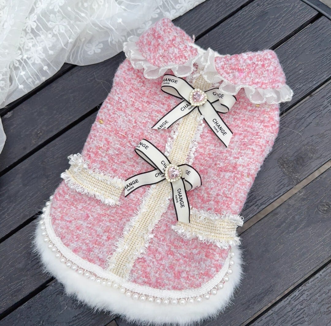 リボンにハート型のビジューも可愛い、秋冬のツイードワンピース♡裏地もフリースであったかです。冬のお散歩にお洒落です。