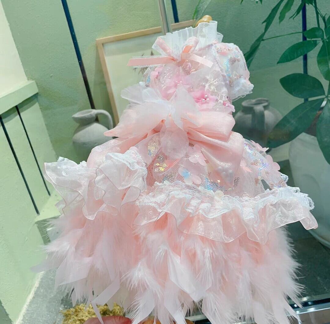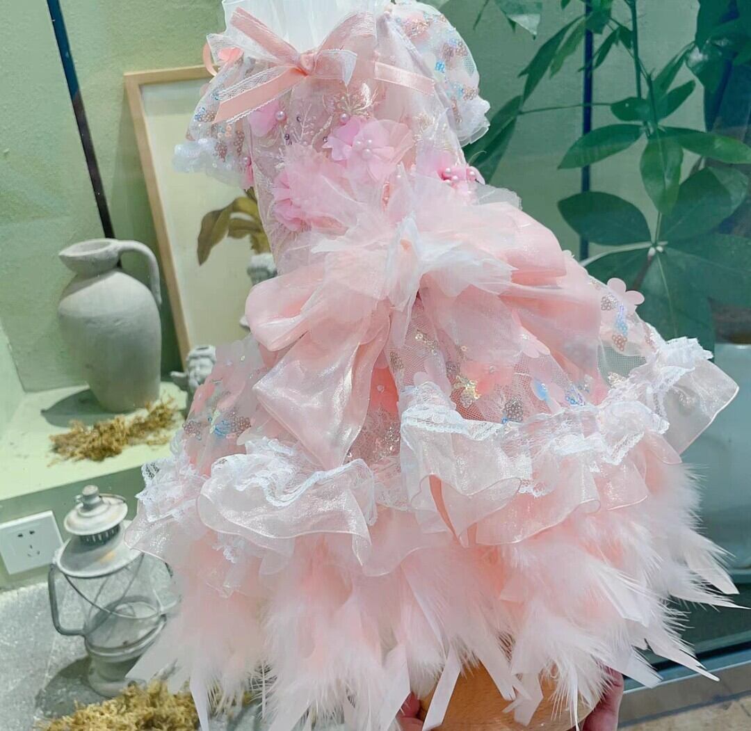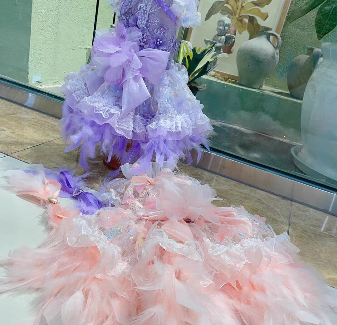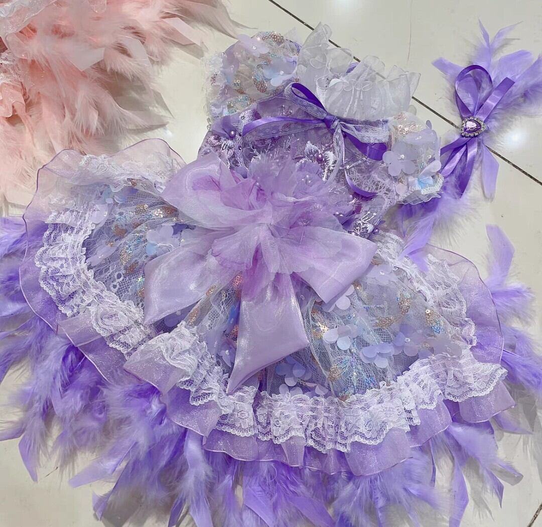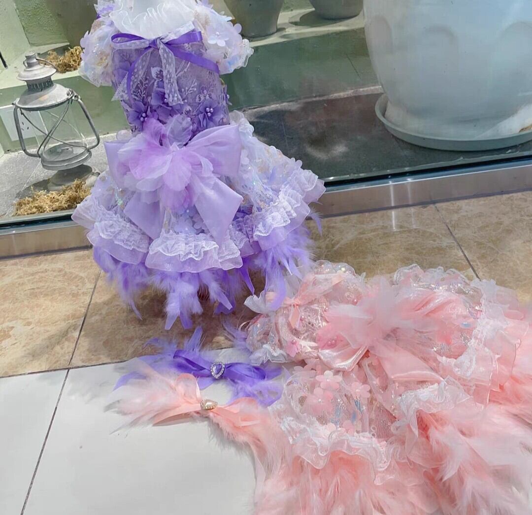 【予約商品】羽根飾り付きのフラワーモチーフのドレス 2カラー(リボン オプション)