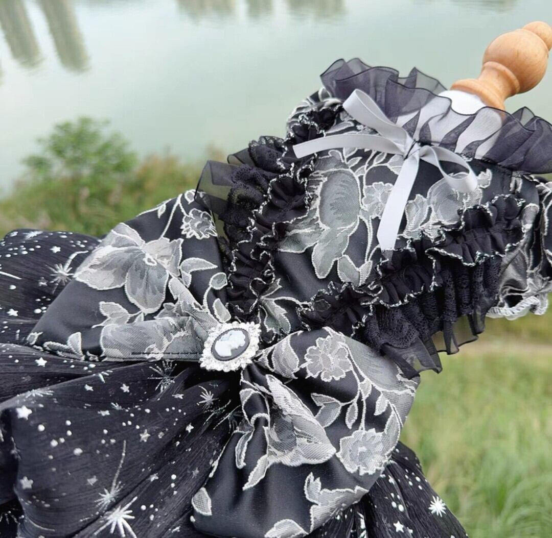 腰のリボンもレトロな花柄生地で、カメオのような飾りがエレガントさを演出しています。