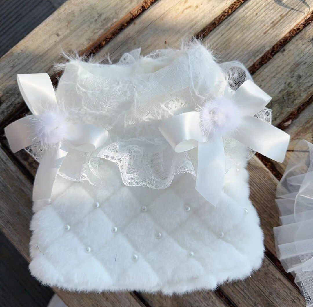 リボンやパール飾りがエレガントなフェイクファーのあったかベストとキャミソールドレスの2点セット♡ピュアホワイトのお嬢様にぴったりなラブリーなセットアップです。