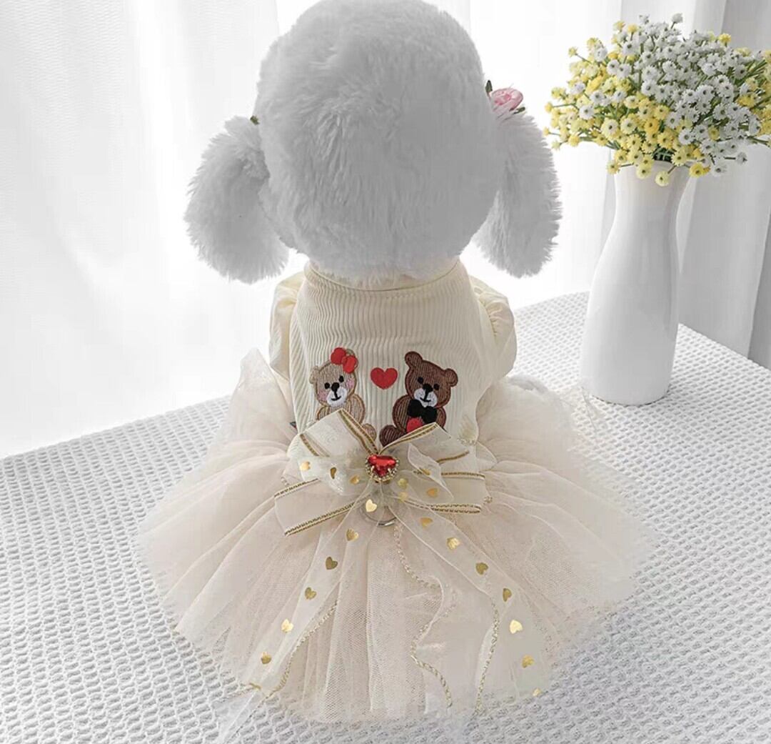ハート型ビジューやハート柄のリボン。くまちゃんモチーフのキュートなワンピース。