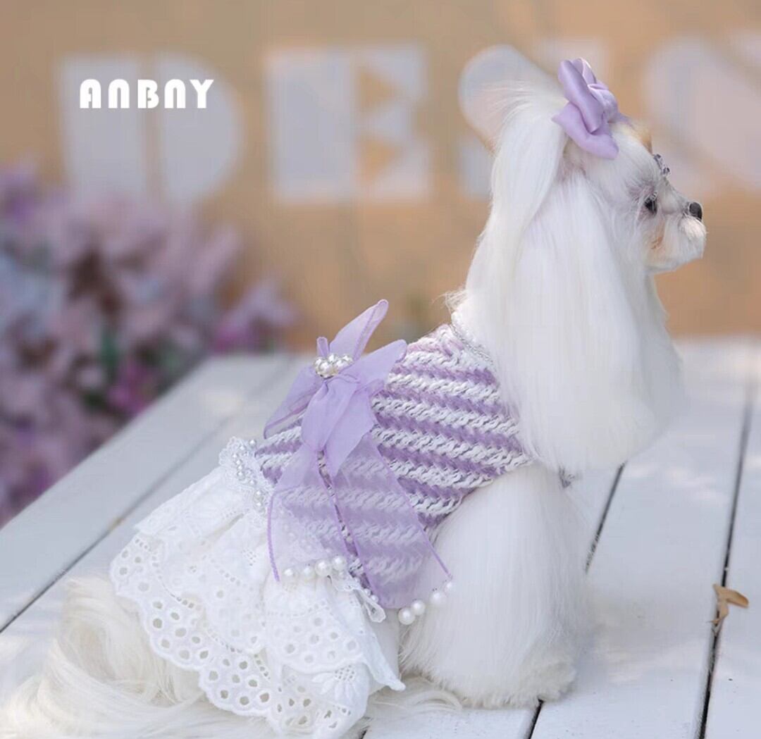 パール飾り付きの優しいカラーのリボンや、裾のホワイトコットンフリルが可愛い、パープルの秋冬ワンピース♡