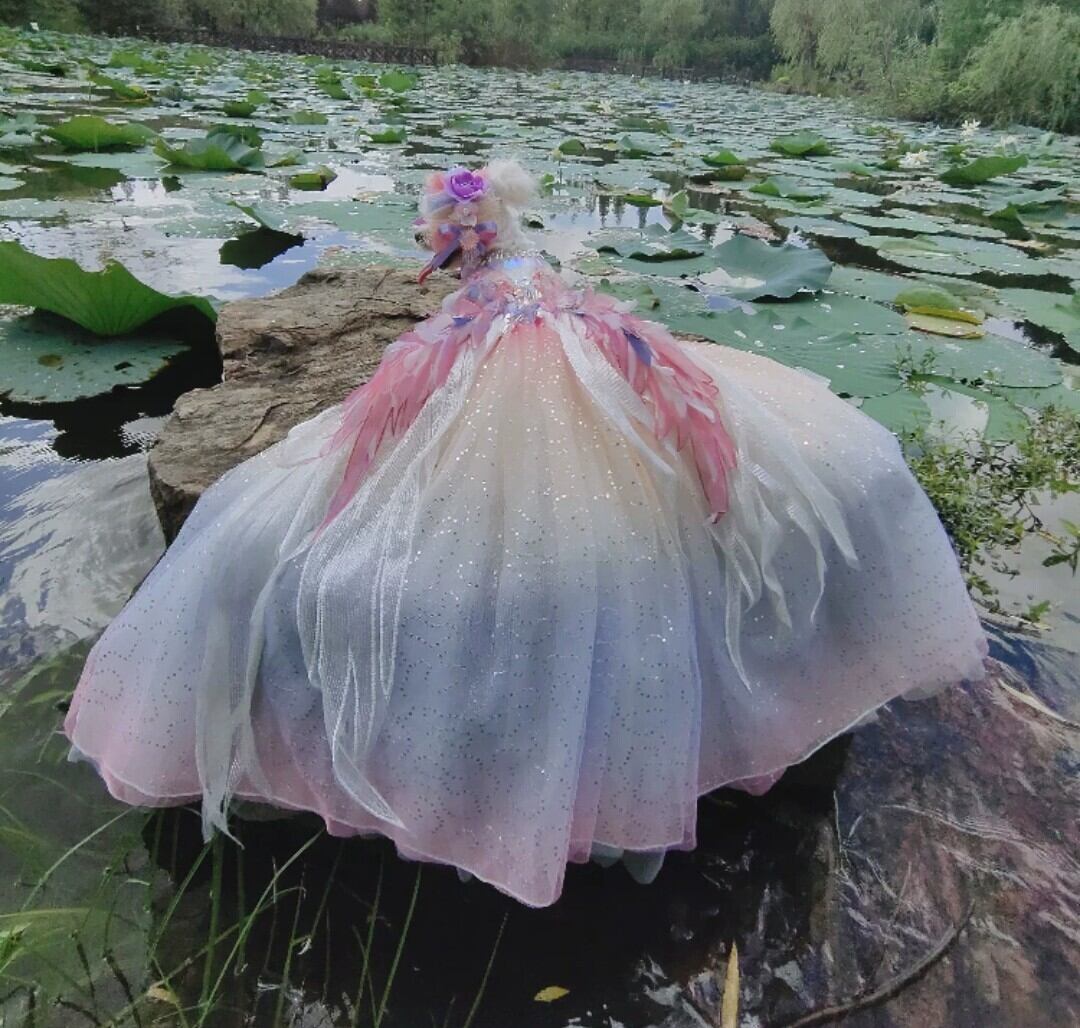天使をイメージしてデザインされたで美しいロングドレス♡背中には天使の翼を思わせるピンクの長い羽モチーフにフラワーなどの様々な飾りが豪華。スパンコールがあしらわれたドレスのカラーグラデーションがとても美しく、特別な一品。