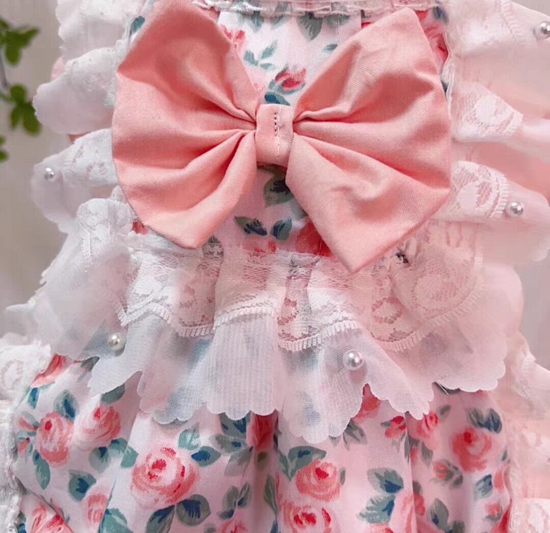 パール飾りの付いたホワイトレースが素敵なローズ柄プリントのパウダーピンクのワンピース♡