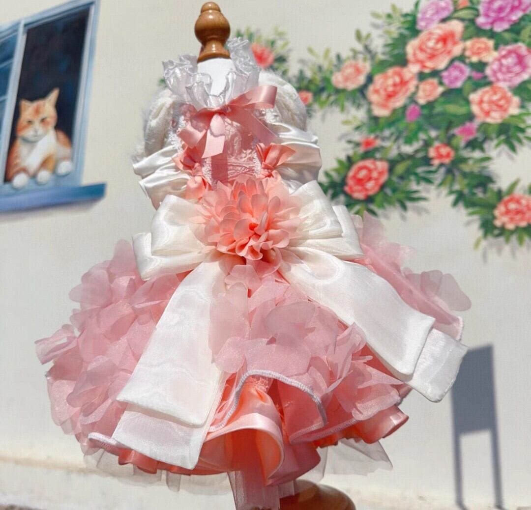 花びら沢山の立体お花モチーフ付きのホワイトのロングリボン付き。ホワイトフリル×ピンクがエレガントさを引き立てるフラワーモチーフのショートドレス♡